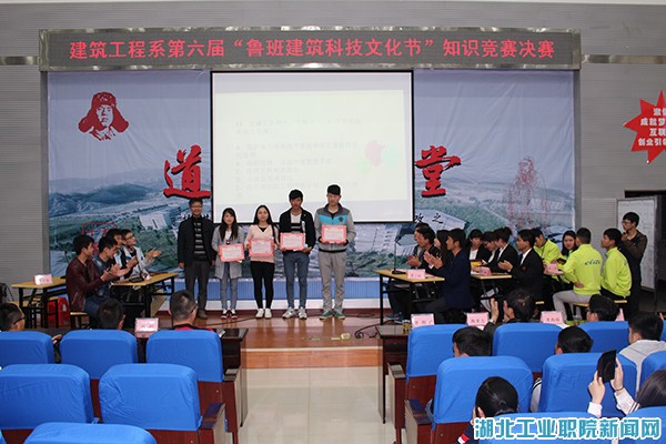 新闻网讯(学生记者李晓天 潘永辛)为营造良好的学习氛围,加强学生对专业知识的学习运用,3月30日晚,建筑工程系第六届鲁班科技文化节知识竞赛在学术报告厅圆满落幕。湖北中江设计院总经理幸西刚、湖北荣耀造价有限公司总经理熊荣志,建筑工程系主任黄朝广、副主任严航及辅导员、教师出席活动。