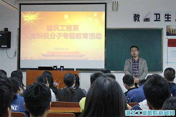 新闻网讯(学生记者李晓天 潘永辛)为进一步加强入党积极分子教育管理,切实提高党员发展质量,引导青年学子树立远大的理想信念和人生目标,建筑工程系党总支计划每年组织全系入党积极分子内开展四次专题教育活动,4月24日下午6:30,建筑工程系在科技楼1402教室,开展2016年度第一次入党积极分子专题教育活动。