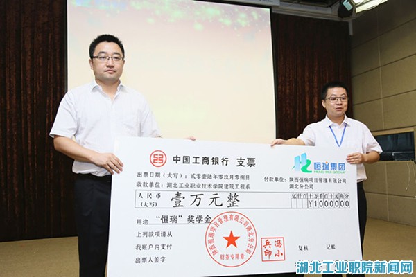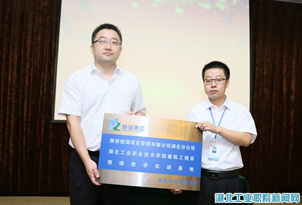 受系主任黄朝广委托,副主任严航代表建筑工程系与冯小兵现场签订了校企合作协议,并向企业授予“湖北工业职业技术学院恒瑞教学实训基地”的匾牌,代表建筑工程系接受了企业捐赠。根据协议规定,陕西恒瑞集团湖北分公司在建筑工程系设立“恒瑞”奖学金,每年提供不低于1万元的资助,用于奖励学业优秀的在校学生。同时,该公司拥有优先吸纳我院毕业生就业的权利。