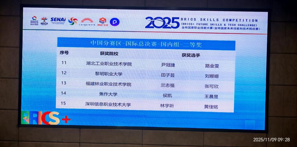 【通讯员:黄朝广、李芬】11月9日,在上海工艺美术职业学院闭幕的2025金砖国家职业技能大赛园艺施工虚拟仿真赛项国际总决赛中国分赛区比赛中,我校建筑工程学院学子尹冠捷、路金雯(指导教师甘汶可、李芬)表现出色,荣获二等奖。